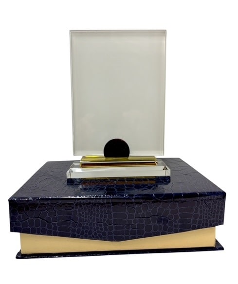 Nathalieglas i 2 storlekar med vit bakgrund, nedre delen på sockeln är i guldfärgat glas.