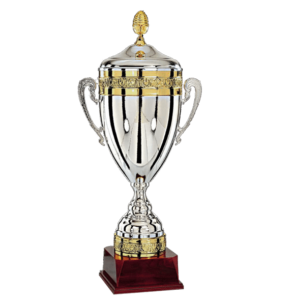 Silverfärgad pokal med gulddetaljer och träsockel. Pokalen finns i 3 olika storlekar