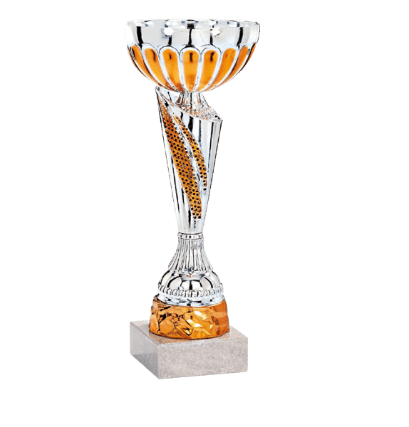 Silverfärgad pokal med detaljer i bärnstenskulör och marmorsockel. Pokalen finns i 4 olika storlekar. Plats för gravyrplåt på sockeln.