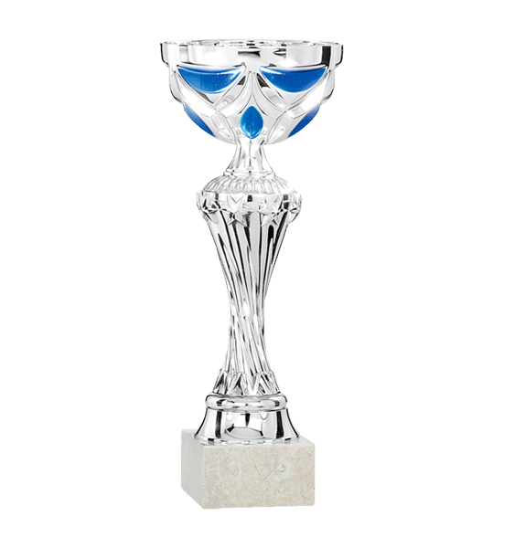 Silverfärgad pokal med “skruvad” kropp. Upptill på kroppen stjärnor. Kupan är i silvervalör med blå inslag.