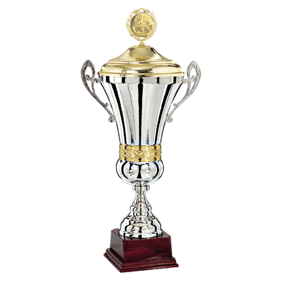 Silverfärgad pokal med gulddetaljer och träsockel. Pokalen finns i 3 olika storlekar
