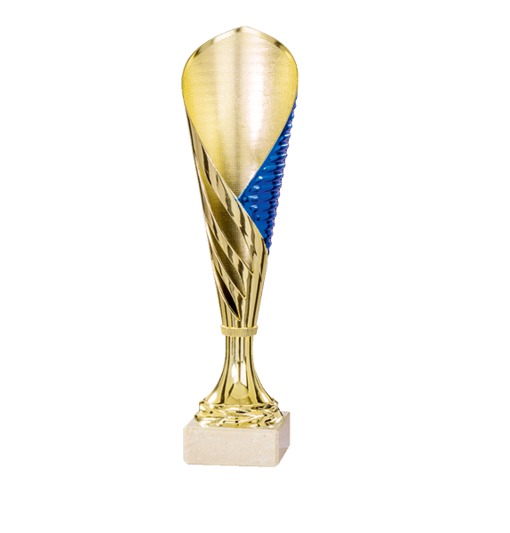 Guld- och blåfärgad kupa i plast, vit marmorsockel.