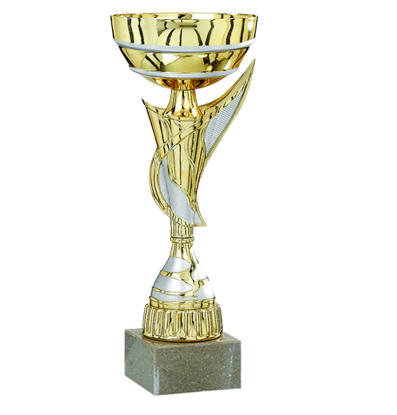 Pokal i flera olika storlekar. Pokalens “kropp” är tvåfärgad med utstickande “vågor.