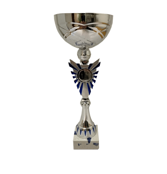 Silverpokal med blått inslag med motivplats. Välj till en graverad plåt till sockeln.