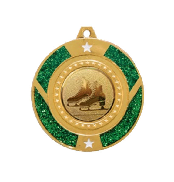 Härligt glittrande med grönt färginlägg. Upptill och nedtill en stjärna vilket gör att denna medalj passar utmärkt som deltagarmedalj på stjärntävling.