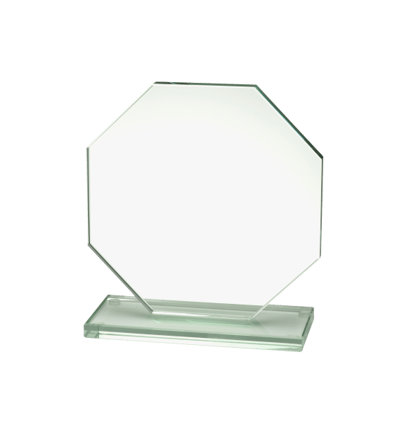 Oktantformad glasstatyett med sockel i ljust grönfärgat glas.
