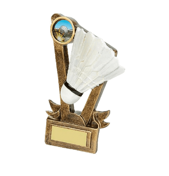Retsinstatyett med motiv av en vit badmintonboll och badmintonracket