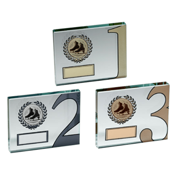 Glasplakett 100x80mm med tryckt siffra (1,2,3) på kanten samt konståkningsmotiv