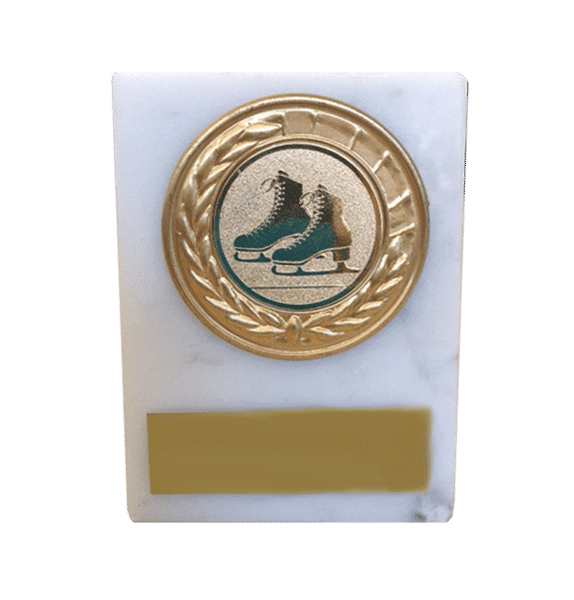 Vit marmorplakett med konståkningsmotiv.