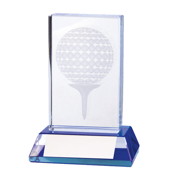 Transparent glasstatyett med golfmotiv inuti glaset, blå glassockel. Levereras i etui.