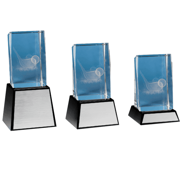 Glasstatyett golf med 3-D motiv inuti glaset. 3 storlekar, 100mm-120mm-145mm.