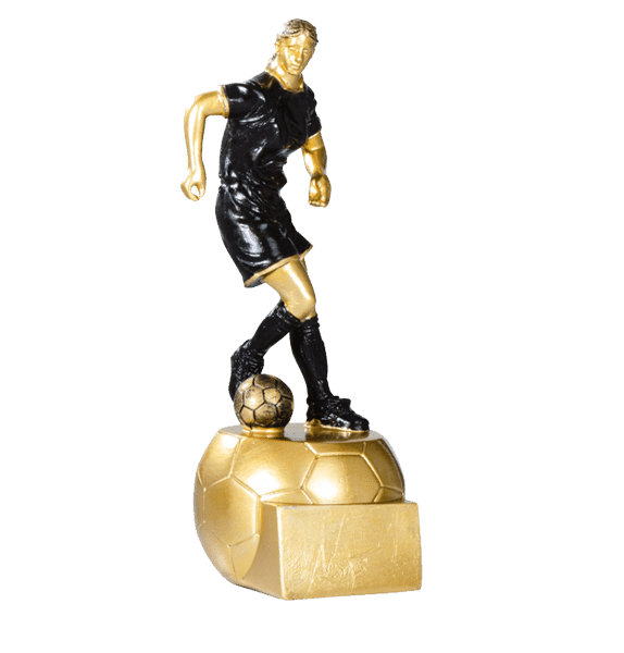 Kvinnlig fotbollsspelare på sockel formad som en boll.