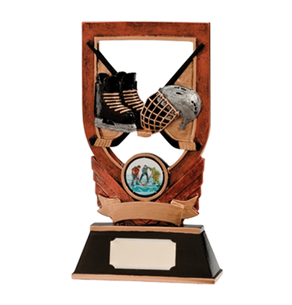 Resinstatyett med skridskor, klubbor och hjälm.
