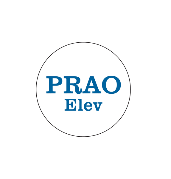 PRAO-knappar, med säkerhetsnål på baksida. Blått tryck mot vit botten.