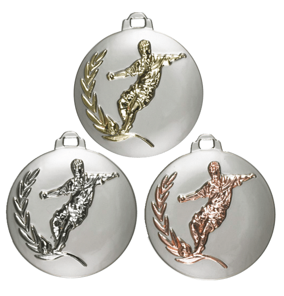 Fotbollsmedalj 50mm, silverfärgad botten med spelare i silver- eller bronsvalör.