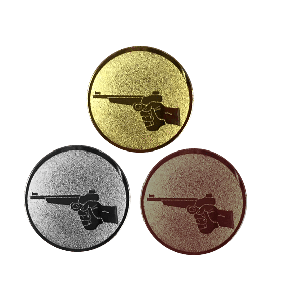 Skyttepistol idrottsmotiv. Storlek är ca 25mm i metall.