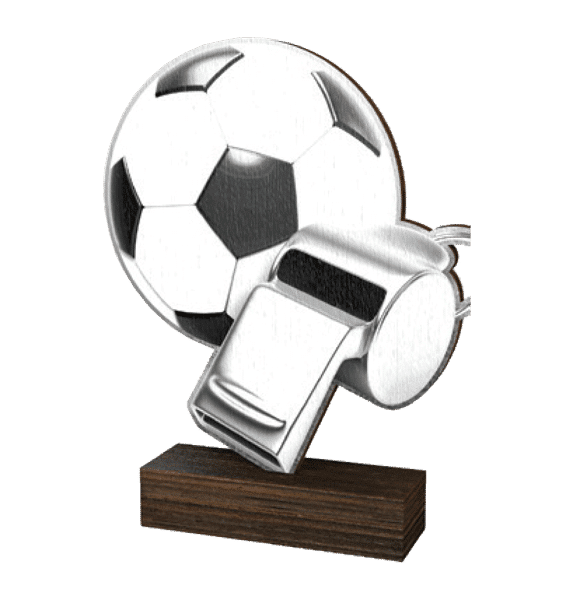 Domarstatyett i trä med fotboll och domarpipa