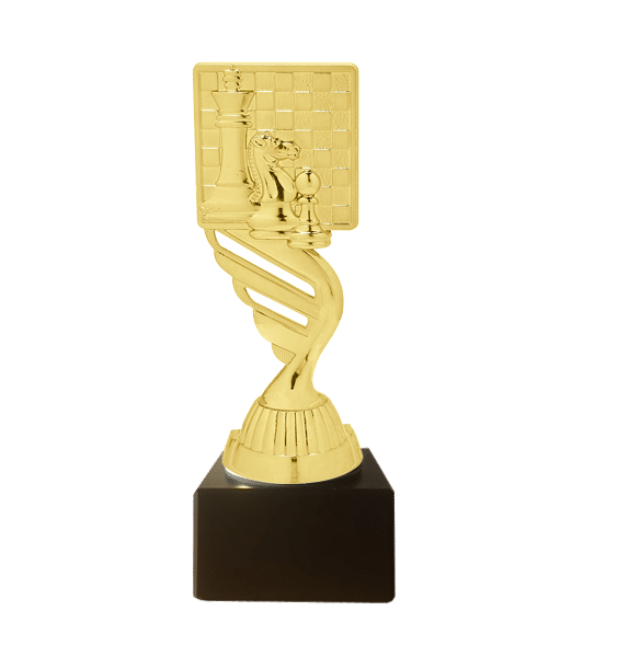 Statyett i guldfärg med motiv av spelpjäser samt ett bräde i bakgrunden.